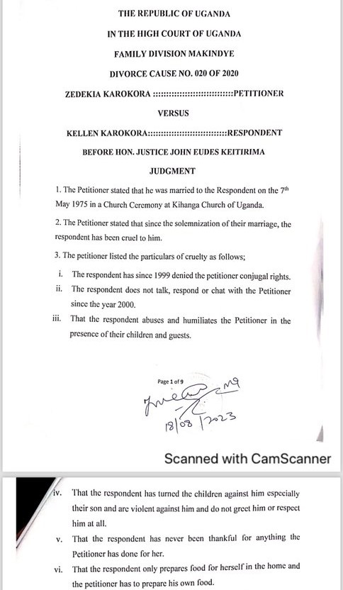 In his pleadings before the court, Mr. Zedekiah Karokora said he married Kellen Karokora on May 7th,1975, in a church ceremony at Kihanga Church of Uganda. He told the court that since the solemnization of their marriage. Mrs. Karokora has been cruel to him.